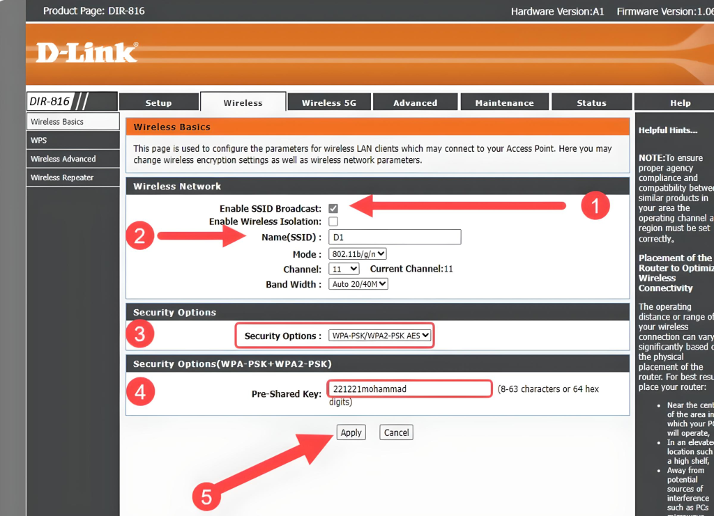 Security Mode (وضعیت امنیتی): انتخاب گزینه WPA2-PSK توصیه میشود که امنیت بالاتری دارد.
